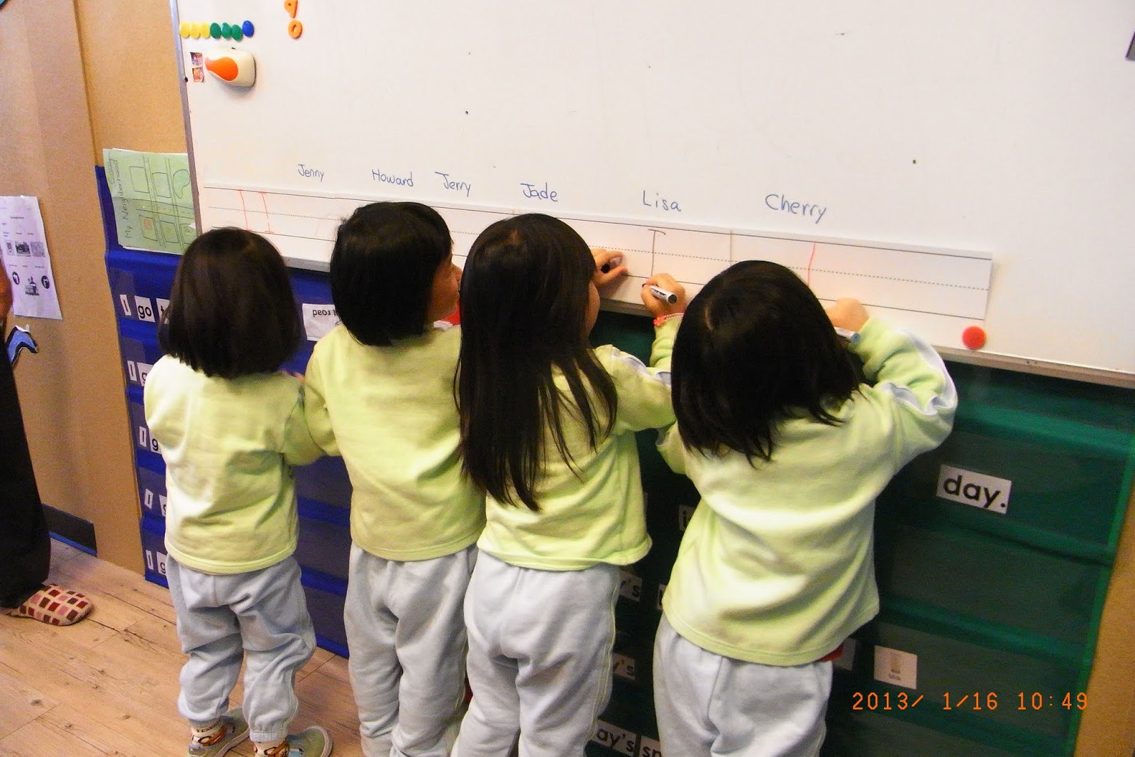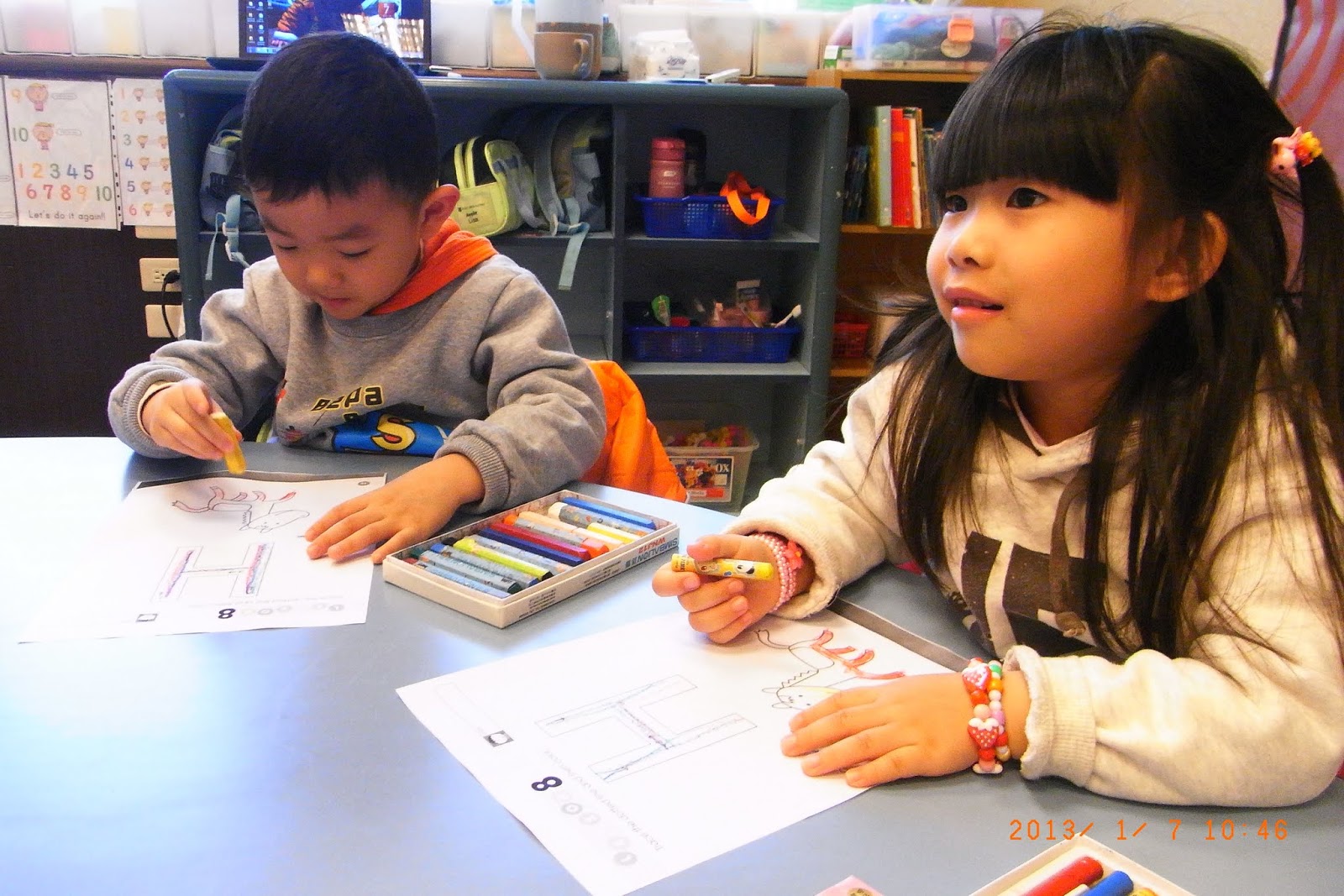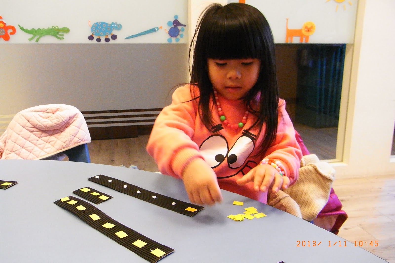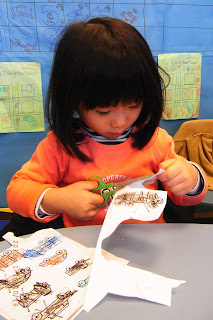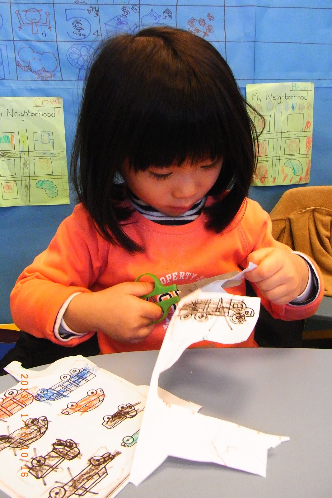 Art Class: Jenny and Lisa could hold scissors very well. They were helping me cutting out the cars and places for art class.