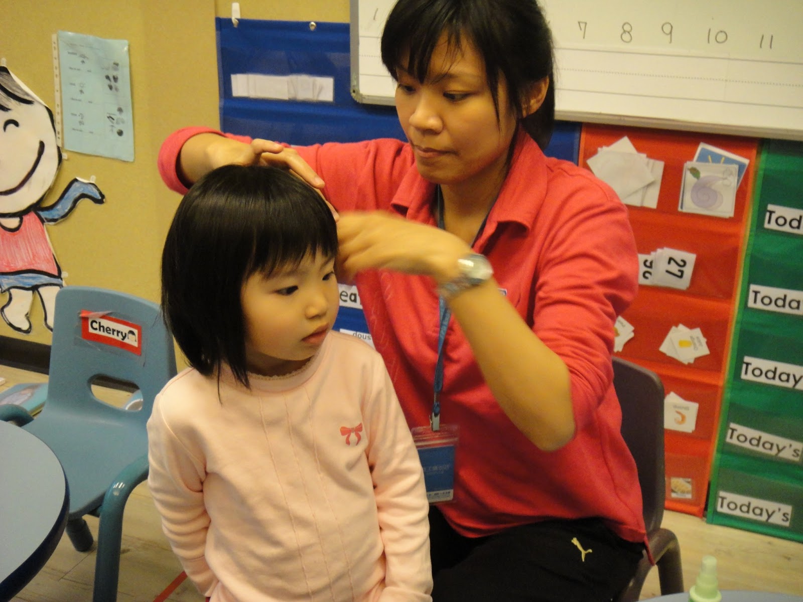 Hair time: I tie girls' hair before they go home. Girls in Apple class love to be pretty.