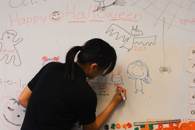 Halloween: We talked about Halloween and learned so many new words about Halloween. We also read a story about Trick-or-Treat. This week is all about Halloween.