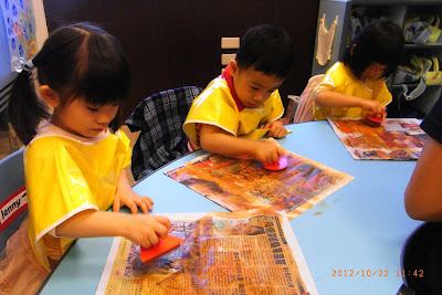 Art Class: Making Jack-o-Lanterns with orange newspaper.